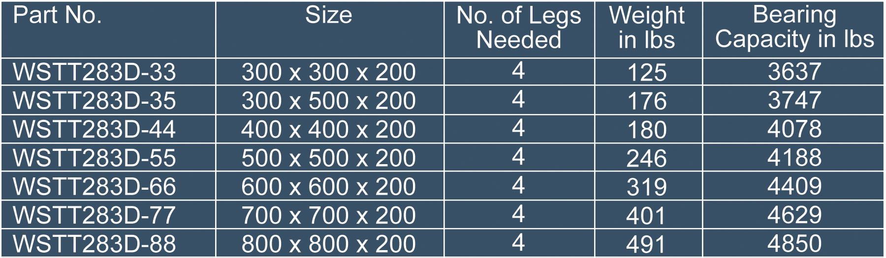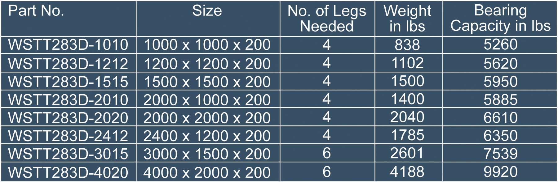 Note: Bearing capacity is with fixable legs. Special size tables on request.